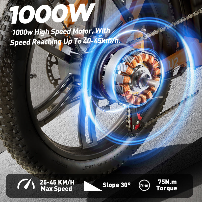 - The motor output power is 1000W and the torque is up to 75N.m, which can cope with various terrains. Capable of carrying up to 396 pounds and climbing steep hills, our motors have the performance you need.