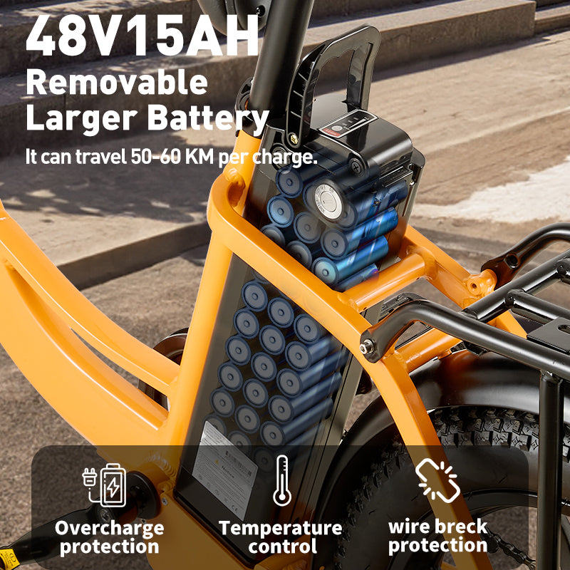 - With a whopping 48V15AH capacity, it offers remarkable endurance, powering you up to 50-60km in pedal-assist mode.